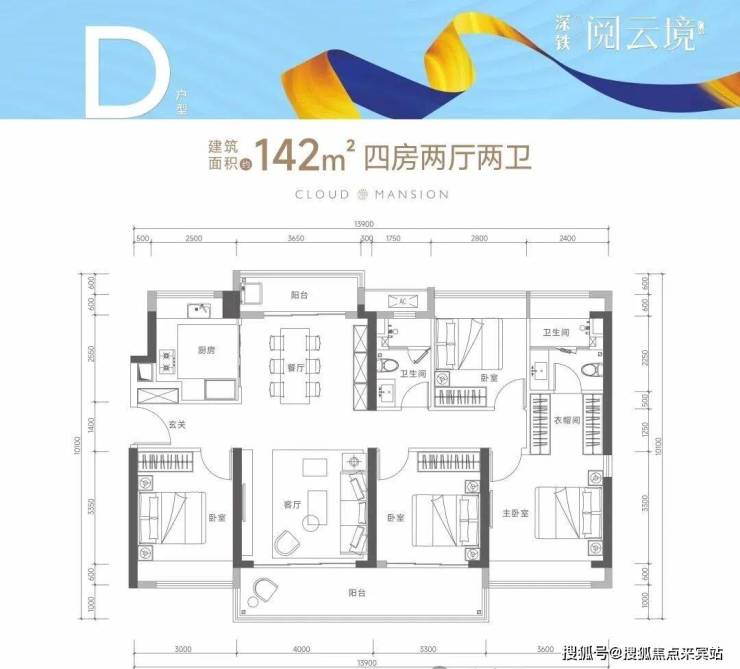 142㎡的4房2厅2卫,(D户型,1栋2单元05户型)设计的是竖厅南北通透格局,客厅4米开间,四开间朝南,双阳台设计,4个卧室分别做到了3.6米/3.3米/3米/2.8米的宽度,主卧大套房设计,客厅连接次卧出7.3米长的大阳台,U型厨房,得房率75-77%(不含赠送),大阳台主朝东南朝向。