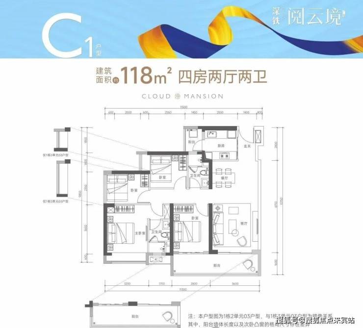 118㎡的4房2厅2卫(C1户型,1栋2单元/3单元03户型),设计的是经典竖厅格局,进门独立玄关,客厅3.5米开间,LDKB一体化设计,动静分区,四开间朝南,4个卧室分别做到了3.2米/2.8米/2.55米/2.35米的宽度,客厅连接次卧出6.4米长的大阳台,二字型厨房带1个小生活阳台,得房率75-77%(不含赠送),阳台都是朝南向。
