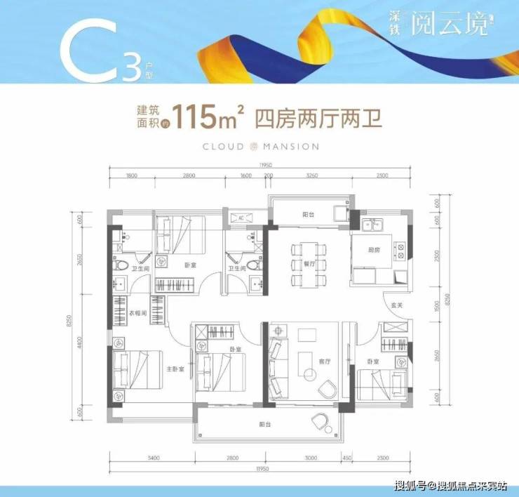 115㎡的4房2厅2卫(C3户型,仅1栋3单元01户型),设计的是竖厅南北通透格局,客厅3.45米开间,四开间朝南,双阳台设计,4个卧室分别做到了3.4米/2.8米/2.8米/2.3米的宽度,主卧大套房设计,客厅连接次卧出5.8米长的大阳台,U型厨房,得房率75-77%(不含赠送),大阳台主朝西南朝向。