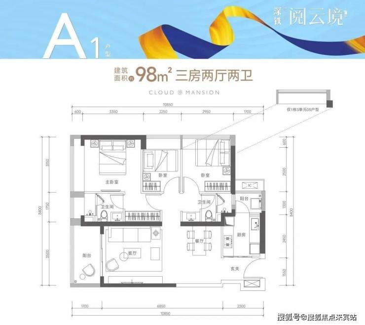 98㎡的3房2厅2卫(A1户型,1栋2单元01户型/1栋3单元05户型),设计的是竖厅格局,进门独立玄关,客厅3.5米开间,LDKB一体化设计,动静分区,3个卧室分别做到了3.15米/2.95米/2.25米的宽度,二字型厨房还带1个小生活阳台,得房率75-77%(不含赠送),阳台朝西向或东向。