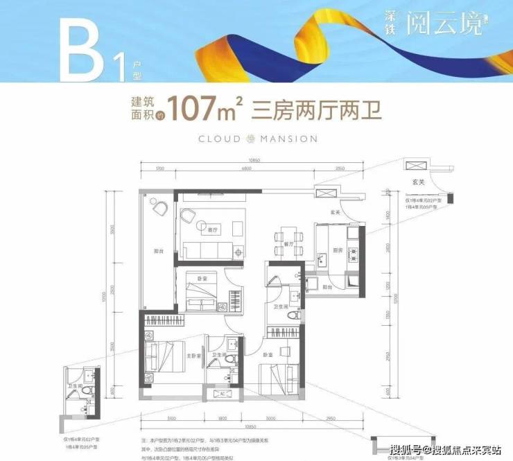 107㎡的3房2厅2卫(B1户型,1栋2单元02户型/1栋3单元04户型)设计的是竖厅格局,进门独立玄关,客厅3.5米开间,LDKB一体化设计,动静分区,3个卧室分别做到了3.1米/3米/2.5米的宽度,客厅连接次卧出6米长的大阳台,二字型厨房还带1个小生活阳台,得房率75-77%(不含赠送),阳台有朝西向、朝东向或朝南向。