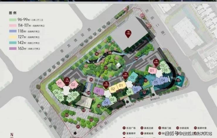梯户比:1栋二单元3梯6户、三单元和四单元3梯4户、五单元3梯5户