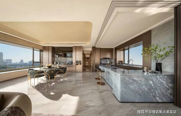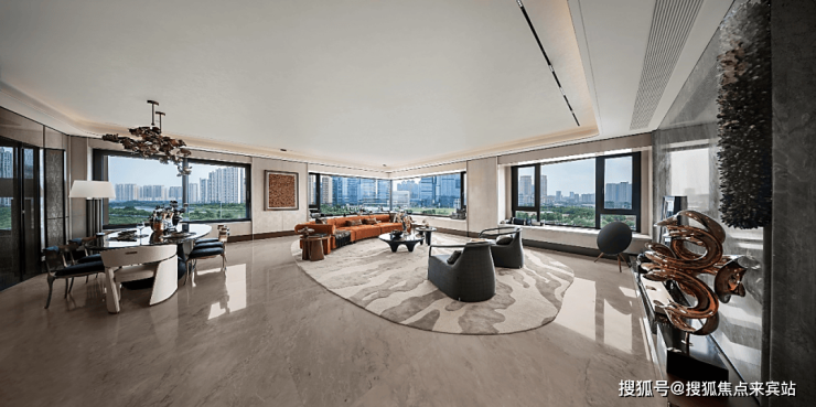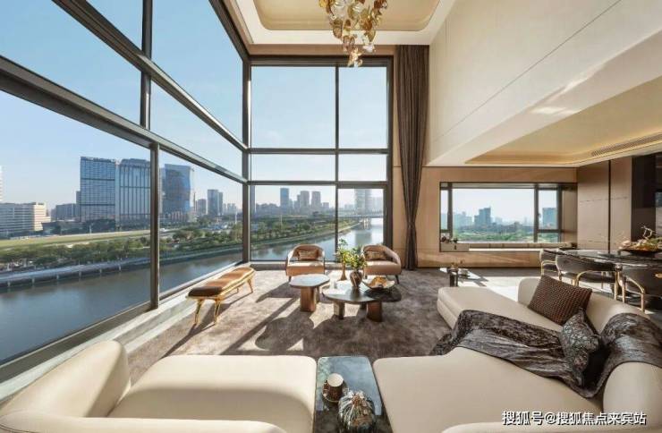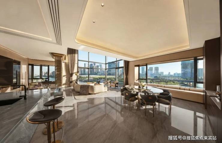 项目打造了震撼的三面环幕式全景采光望江飘窗,设计全南向 270°环幕无界转角窗,结合端厅设计大面积的落地玻璃,形成融合、延伸、无边界的空间,让居者身处家中即可沉浸于 IMAX 级观景体验。所有的主要活动区都占有一线江景资源,极目江河天地阔,为业主带来更具品质且自然的隐奢生活。