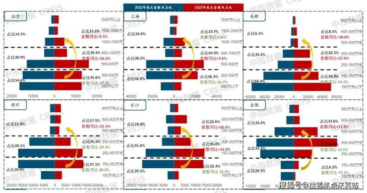 从新房成交结构来看,2023年,多个城市新房套总价上涨,中高总价段成交套数占比提升,改善性住房需求成为房地产市场重要支撑。其中北京500-1000万总价段成交套数同比增长26.2%,占比提升8.4个百分点,而500万以下产品成交套数同比下降17.3%,占比下降9个百分点。成都250-500万、500万以上总价段的项目成交套数在低基数下同比分别增长27.6%和38.8%,占比分别提升7.1个、2.4个百分点。
