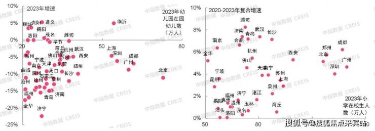 注:重庆2023年幼儿园在园幼儿数88万,增速为-9%,在校小学生为203万,近三年复合增速为-0.5%,未在图中展示。上海、临沂、潍坊、商丘、毕节、揭阳、遵义、聊城、贵阳尚未公布2023年幼儿在园数据,采用2022年数据及增速。苏州、商丘、揭阳、玉林、昆明尚未公布2023年小学在校生数据,采用2022年数据及两年复合增速。
