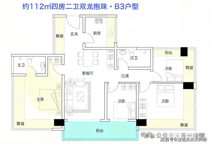 112㎡的4房2厅2卫(B3户型),设计的是竖厅双龙抱珠格局,进门独立入户玄关,餐客厅一体化设计,四开间朝南,全屋八面飘窗,主卧+1个次卧270°无柱转角飘窗,U型厨房,卫生间干湿分离,得房率约100%(包含赠送),客厅连接次卧出大阳台西南朝向。