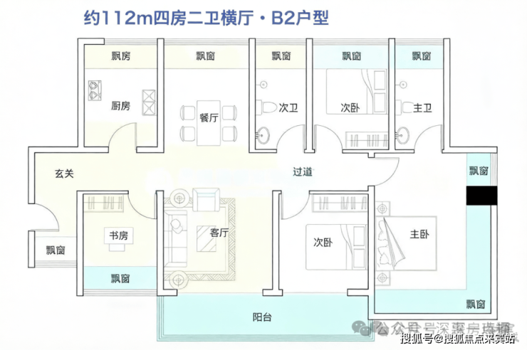 112㎡的4房2厅2卫(B1户型),设计的是横厅南北通透格局,进门入户玄关,餐客厅一体化设计,五开间朝南,全屋十面飘窗,主卧270°无柱转角飘窗,U型厨房,卫生间干湿分离,得房率约100%(包含赠送),客厅连接餐厅出大阳台西南朝向。