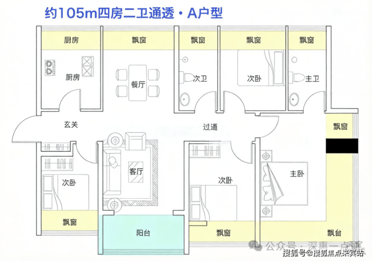 105㎡的4房2厅2卫,设计的是竖厅南北通透格局,餐客厅分离设计,四开间朝南,全屋十面飘窗,主卧270°无柱转角飘窗,U型厨房,卫生间干湿分离,得房率约100%(包含赠送),阳台东南朝向。