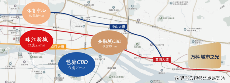 万科城市之光位于三大CBD毗邻的老城居住中心,成为承接CBD居住需求的桥头堡;城市东进发展战略的推动,珠江新城CBD、琶洲CBD、国际金融城三大城市商务板块三足鼎立成为“广州金三角”。