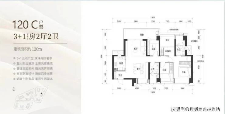 120㎡:客厅与卧室连通9.6㎡超大阳台,主卧带5.2㎡衣帽间,还有观景小阳台,主要为东南和西南朝向