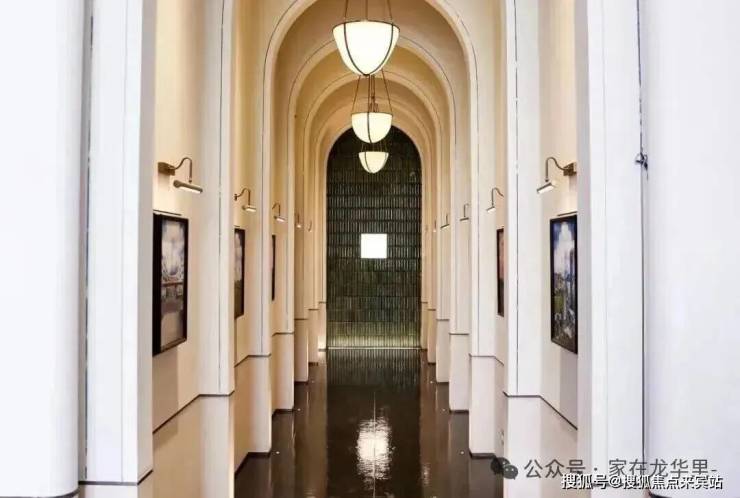 主入口外场是酒店式落客区围合空间,中间是开敞大气的跃升式入口,两侧运用维纳多石材铺贴,公区整体质感突出。