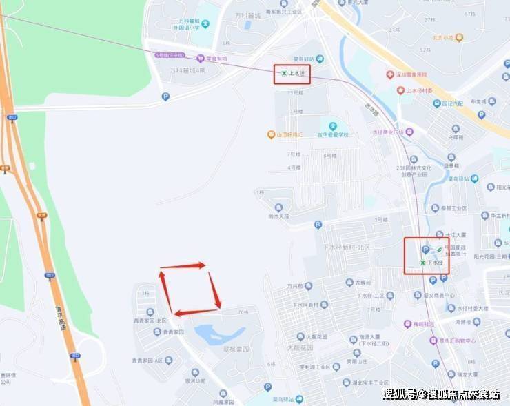 项目毗邻清平高速入口仅500米,约30分钟速达福田;地铁5号线上水径站、下水径站距项目约1.5公里,需公交通勤接驳;规划中的地铁25号线拟设“水径西站”仅200米,未来直通坂田科技城,进一步提升轨道交通便利性;周边1公里内10个公交站点、5条地铁换乘线路覆盖,编织出一张高效出行的城市路网。