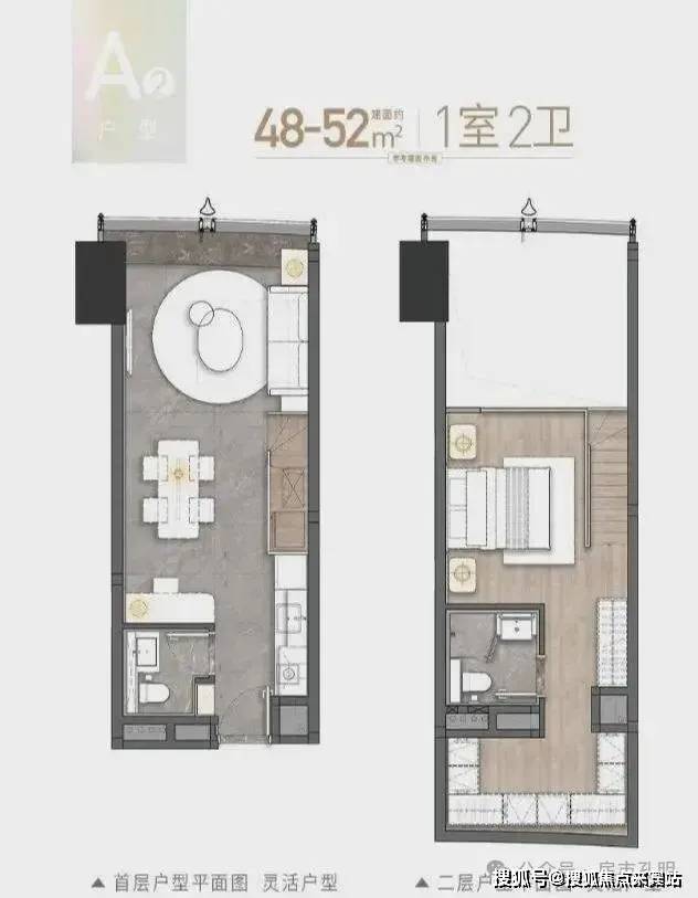 48-51㎡一房、约57-60㎡两房,均有双层使用空间,让如此小户型也有双卫生间,实用性超强。