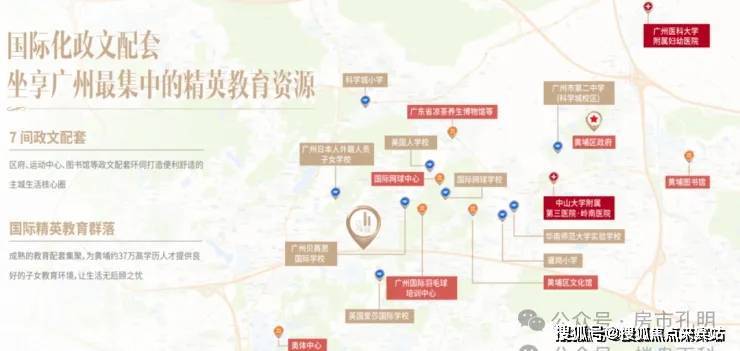教育——项目3公里范围内集聚市二中、爱莎国际学校、贝赛思国际学校、华南师范大学附属黄埔实验学校(南校区)、美国人学校等多所国际院校,营造双语教学环境,培育与国际接轨的菁英人才;