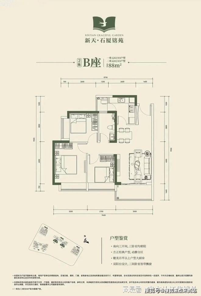 2栋B座一单元02、03户型、2栋B座二单元02、03户型:面积约为88㎡的3房2厅2卫;