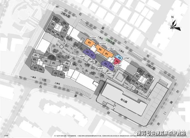 项目总占地约2.1万㎡,由5栋建筑主体组成,4栋塔楼和1个幼儿园组成,采用围合式布局。分为1/2/3栋。其中1栋分为1单元和2单元,2栋分为A、B、C座(2栋B座又由1/2单元组成),3栋为幼儿园。目前推售的是位于社区正中央的2栋B座,共235套房源,小区的回迁房共有1090套。