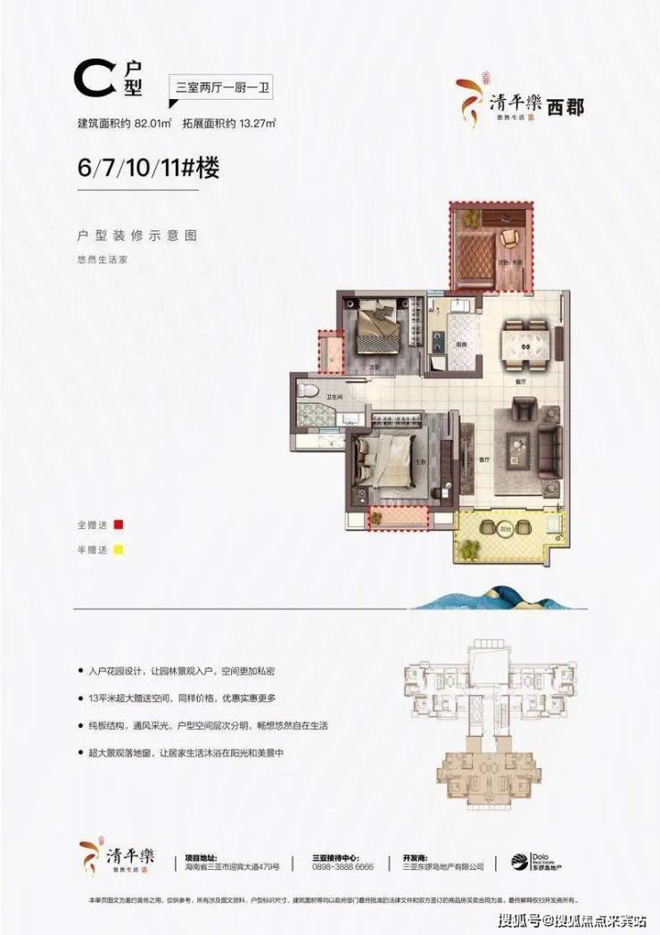 82㎡三房,100㎡四房,超高得房率,270度观景面,观山阅景,尽显从容。二梯四户,纯板式通透式设计,户型方正,尽享三亚生活。