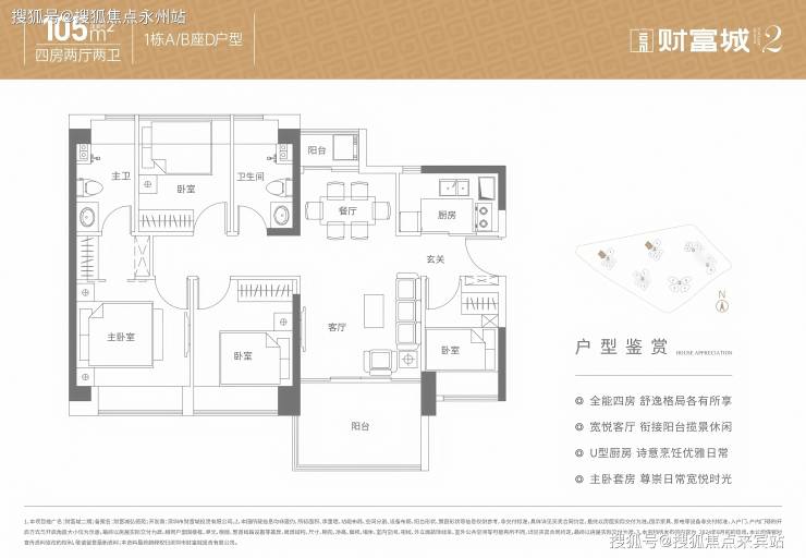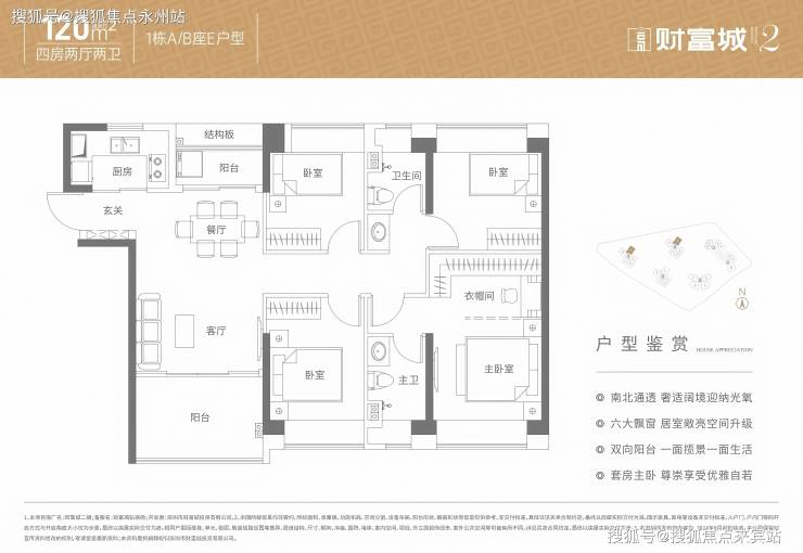 空间布局:竖厅双龙抱珠设计,客厅开间 4 米,四开间朝南,南北双阳台(南向景观阳台约 9.5㎡,北向生活阳台约 4.2㎡)。