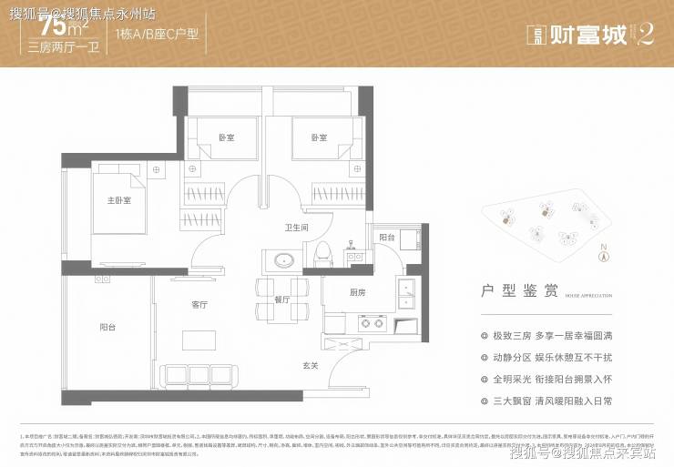 空间布局:竖厅设计,客厅开间 3.5 米,南北双阳台(南向景观阳台约 7.5㎡,北向生活阳台约 3.2㎡),全屋飘窗设计。