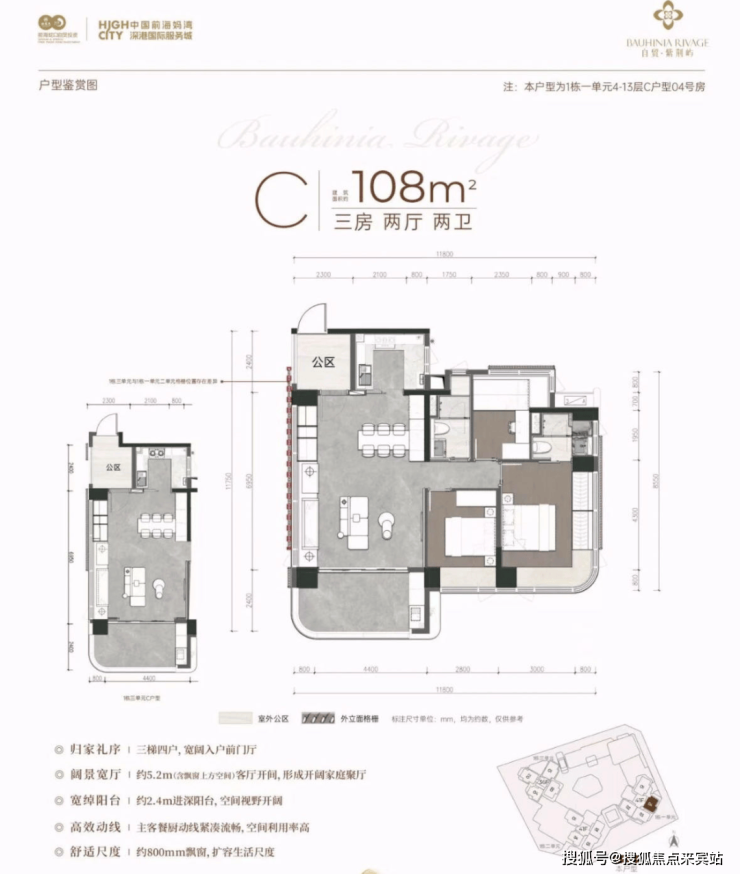 108-111㎡三房两厅两卫,折后总价约1000-1185万,单价约9.3-10.2万/㎡