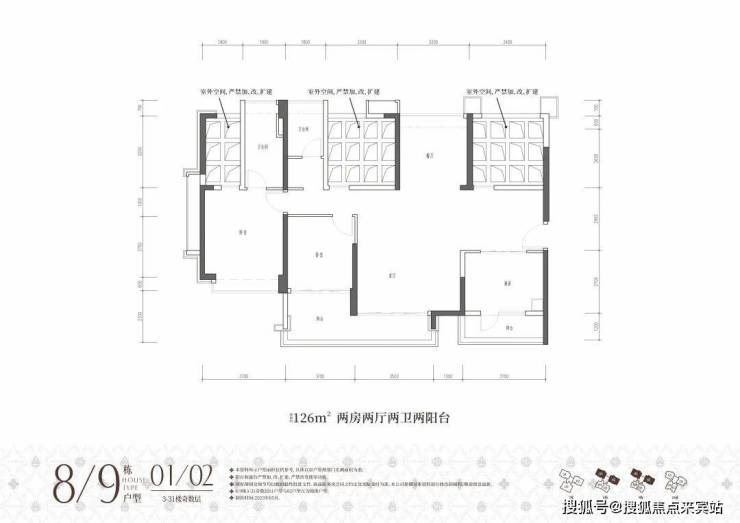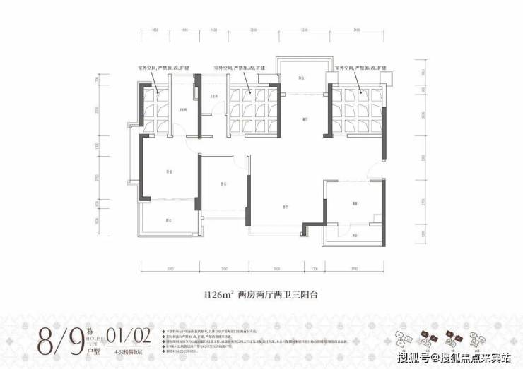 8/9栋01/02户,建面约126㎡,原始结构是两房两厅两卫两阳台或三阳台,奇数层客厅、厨房配有阳台,偶数层是餐厅、主卧,厨房都配有阳台。原始外形轮廓看着还行,但内部镂空位置比较多,搭起来至少可以多两个卧室,不能搭的话就一无是处了!