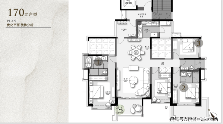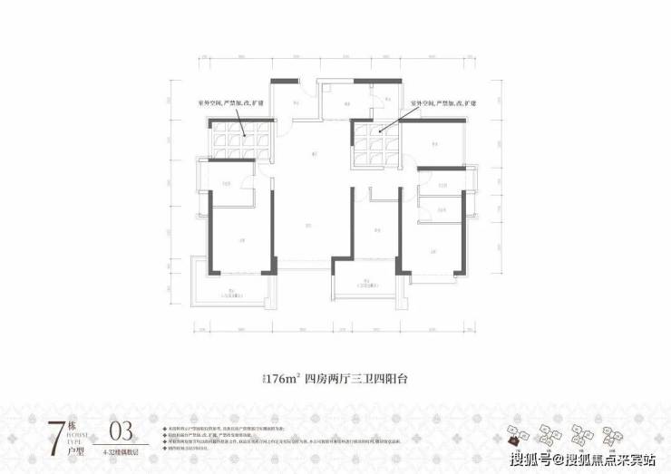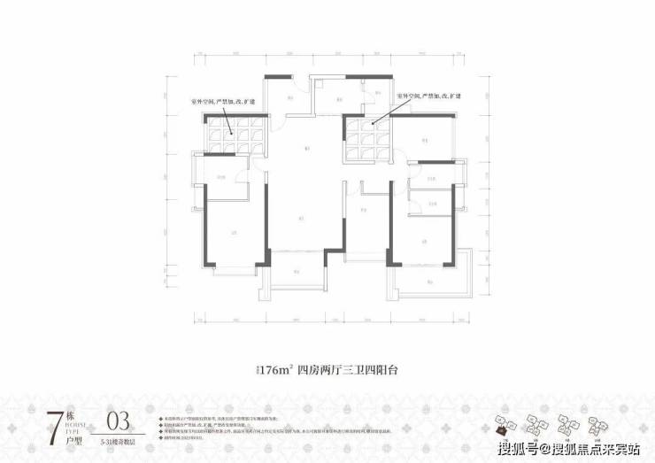 7栋03户,建面约176㎡,原始结构是四房两厅三卫四阳台,奇数层客厅、主卧、厨房都有阳台,偶数层是主卧、次卧、厨房有阳台。奇数偶数层入户门的阳台可做玄关使用,餐厅左侧镂空处搭起来可做卧室,餐厅右侧搭起来可做书房或儿童房使用,最多可做5+1房使用,可塑性非常强。
