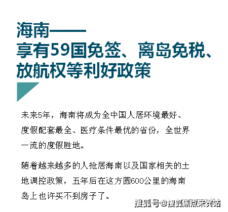 除了海南种种难得的气候条件之外,国家针对海南开展的大力度开放政策,尤其是自贸试验区以及自由贸易港的建立计划,使得海南在“而立之年”迎来经济发展的又一个崭新的契机!作为中国最年轻的“自由贸易试验区”海南未来的发展不可限量!不管是买房还是养老投资,海南,都是最好的选择!