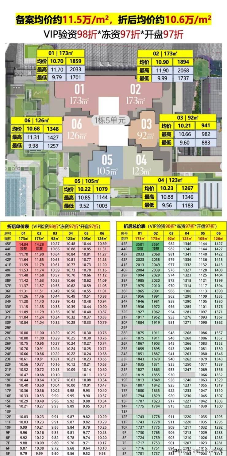 备案均价11.5万/㎡,开盘折扣98*97*97*98后约9折,折后均价约10.3万/㎡。