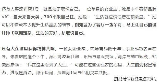 深圳湾1号让精英们趋之若鹜的原因,是“懂得赚有钱人的钱”。就像上面那位“中国巴菲特”形容的,财务自由了,遇到触动灵魂的东西,绝不能错过,绝不能留遗憾。
