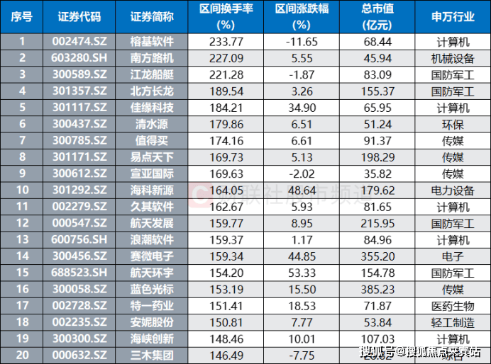 此外,从换手率数据上看,剔除新股影响,累计共有58股周换手率在100%以上。其中,榕基软件、南方路机、江龙船艇3股周换手率在2倍以上,分别达233.77%、227.09%、221.28%。同时,北方长龙、佳缘科技、清水源、值得买、易点天下、宣亚国际、海科新源、久其软件、航天发展、浪潮软件等股周换手率也居前。