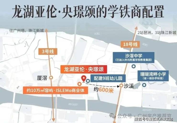 ◎文教中心 菁英未来项目配建9班幼儿园。另项目周边有珊瑚湾畔小学、沙滘中学(仲元中学成员校)、外国语小学(星执)。