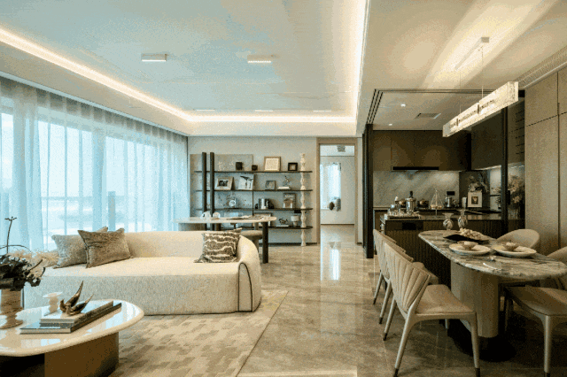 餐客厨一体化设计,实现约40㎡超尺度公区,打破空间的局限性,让烹饪、用餐、娱乐等功能融合,每个场景都能亲密互动。