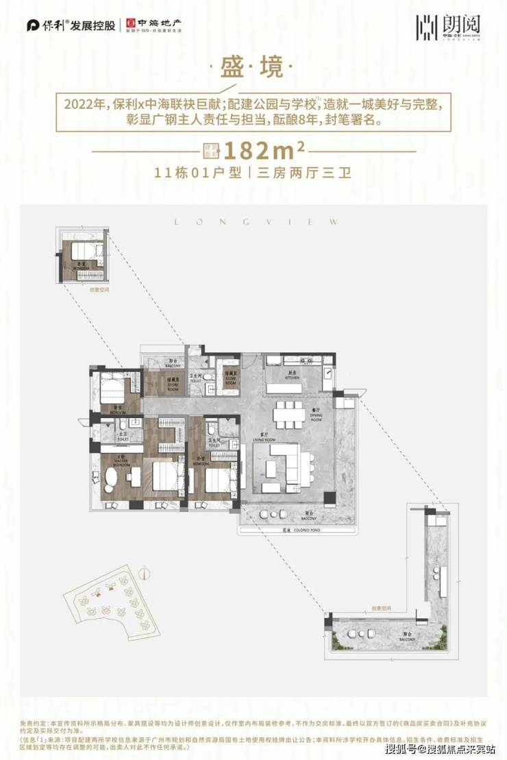 【教育配套】一路之隔就是广东实验中学荔湾学校第三小学部(简称“省实三小”,将于今年9月开学);项目自身配建2所中小学,其中一间已确定为省级名校:广东省实验初中;板块将形成32所学校集群,小学到高中一站式全龄教育唾手可得,打造15分钟教育圈。