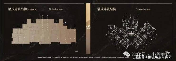 ×塔楼:混合朝向,并非户户朝南,户型间存在遮挡,容易产生对视,室内空气流线差,换气效果相对较差。