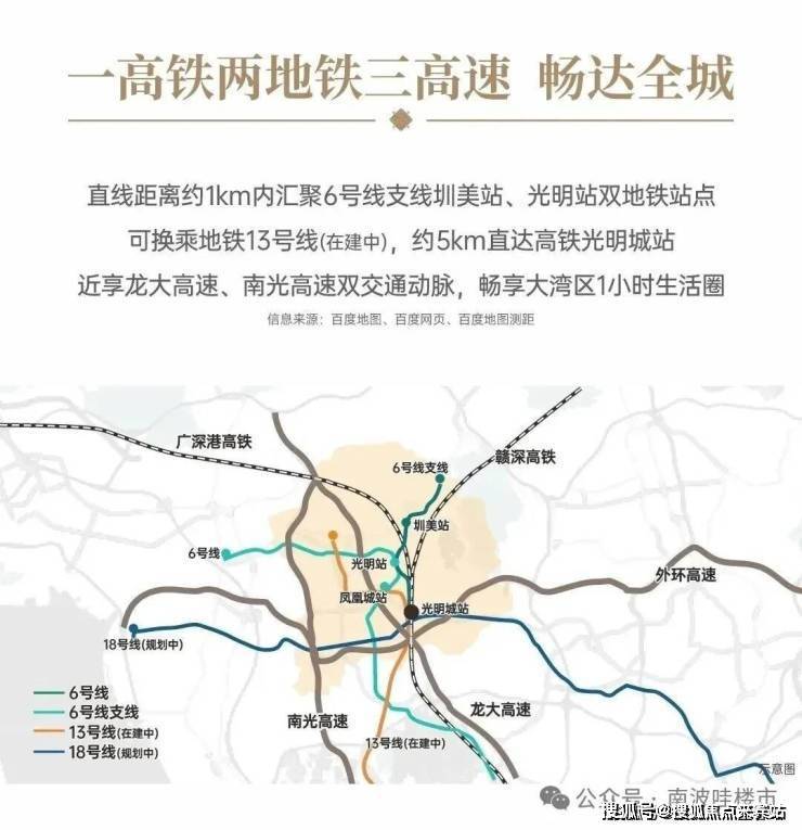 直线距离约1km内汇聚6号线支线圳美站、光明站双地铁站点,可换乘地铁13号线(在建中),约5km直达高铁光明城站,近享龙大高速、南光高速双交通动脉,畅享大湾区1小时生活圈