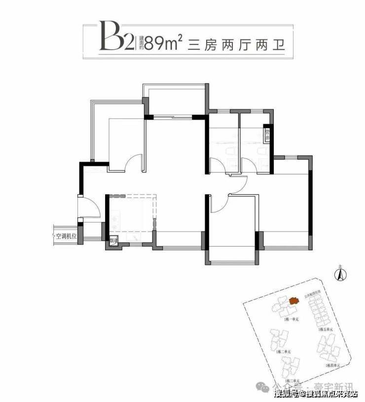 一:建面约89平方A1户型三房两厅两卫