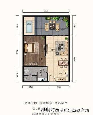 D户型 1+1房建筑面积约63㎡ 一室二厅一厨一卫灵动空间·设计紧凑·精巧实用客、餐、厨自成一体动静分离,干湿分区分寸必用·阔绰自由生活