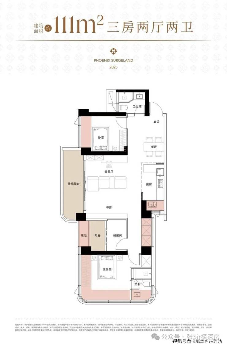 建面约111㎡户型,得房率约94%(包含赠送),西北朝向看一线梧桐山景观。跟102㎡户型布局有点像,也是长条形……