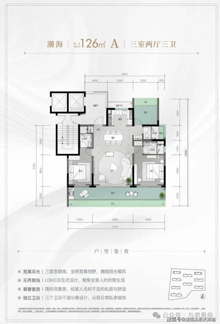5、户型方正,三个卫生间起,超大尺度阳台。