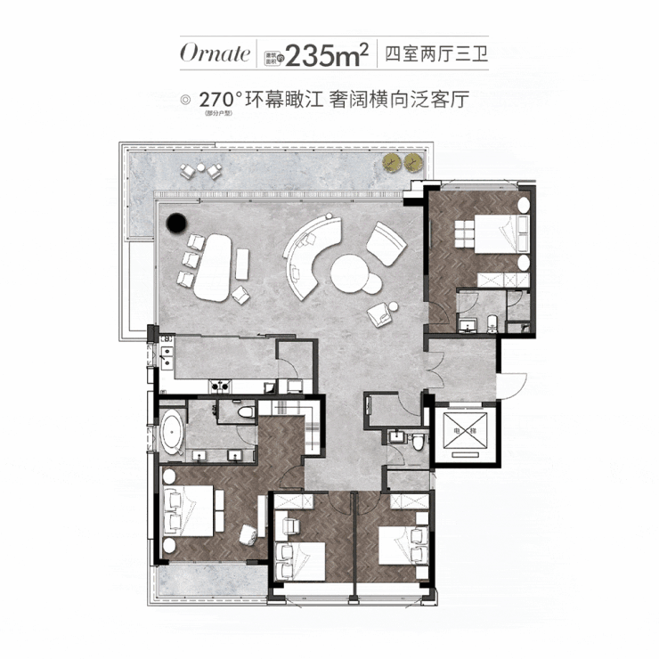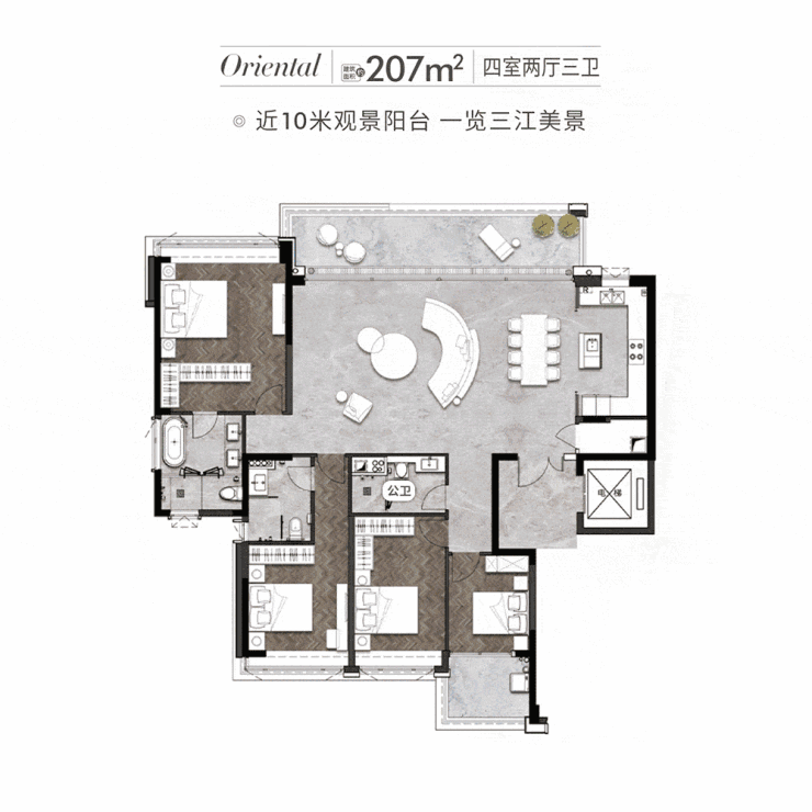 以这套建面约235平4+1房为例,整个公共空间(客厅、餐厅)连着17米L型的阳台。