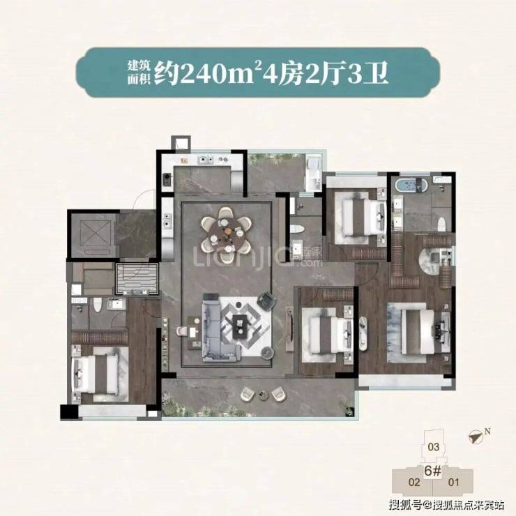 235-240㎡天幕大平层:3 梯 3 户专梯专户设计,18 米南向景观面,双主卧套房配置,LDK 一体化大方厅,南北对流双阳台,无遮挡一线高尔夫景观,均价 17500-25000 元 /㎡,总价 400万起。