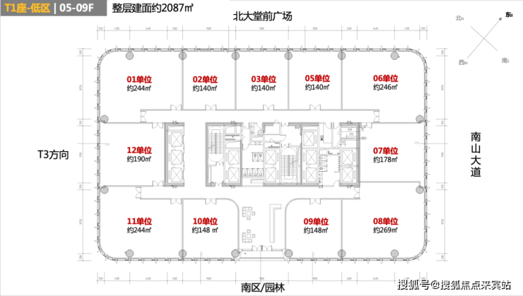 T1整栋:约59041㎡,层高4.4米,整层面积2067-2193㎡,实用率约78%;
