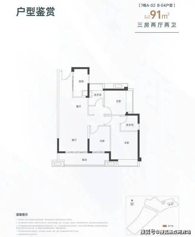 91㎡的3房2厅2卫,设计的是经典竖厅格局,进门入户玄关,LDKB一体化设计,三开间朝南,动静分区,客厅连接次卧出大阳台,L型厨房,公卫三段式分离,得房率约82%(不含赠送),东南朝向。