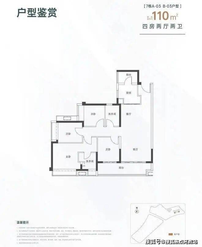 110㎡的4房2厅2卫,设计的是经典竖厅格局,进门入户玄关,LDKB一体化设计,四开间朝南,动静分区,客厅连接次卧出大阳台,L型厨房还带1个生活阳台,卫生间干湿分离,得房率约82%(不含赠送),东南朝向。