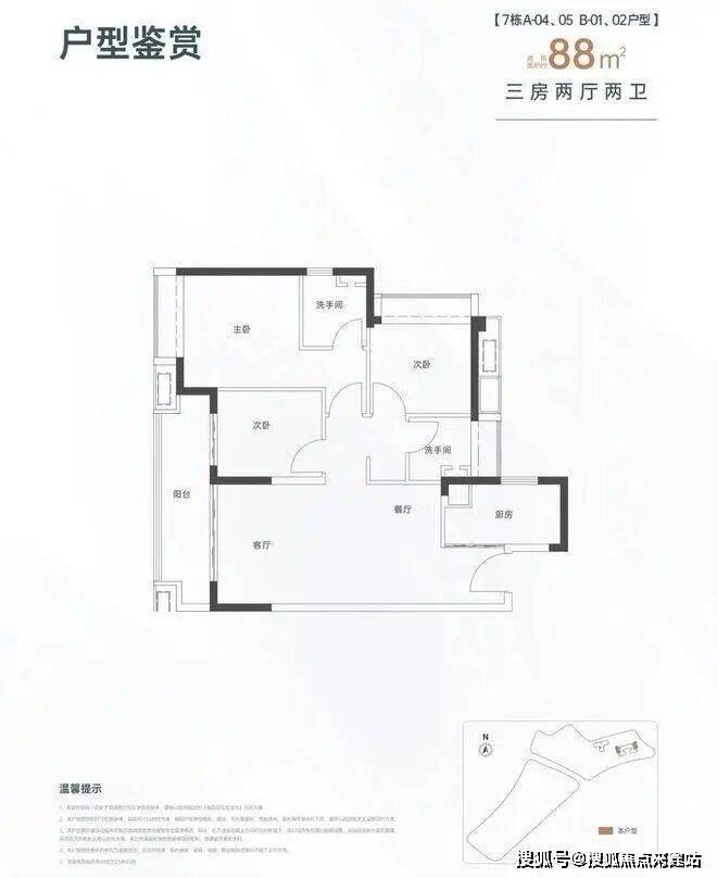 88㎡的3房2厅2卫,设计的是经典竖厅格局,进门入户玄关,LDKB一体化设计,动静分区,客厅连接次卧出大阳台,L型厨房,公卫三段式分离,得房率约82%(不含赠送),西南或东北朝向。