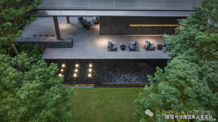 主入口依靠回龙河畔,在开敞式迎宾前广场设置跌水景观,结合名贵树种罗汉松,让尊崇出入道是寻常;超30m门庭设计,以仿古代照壁之手法,精选浪淘沙天然石材与古铜型材,尽显当代精奢雅致气质,演绎独属于东方门第的尊崇仪式。
