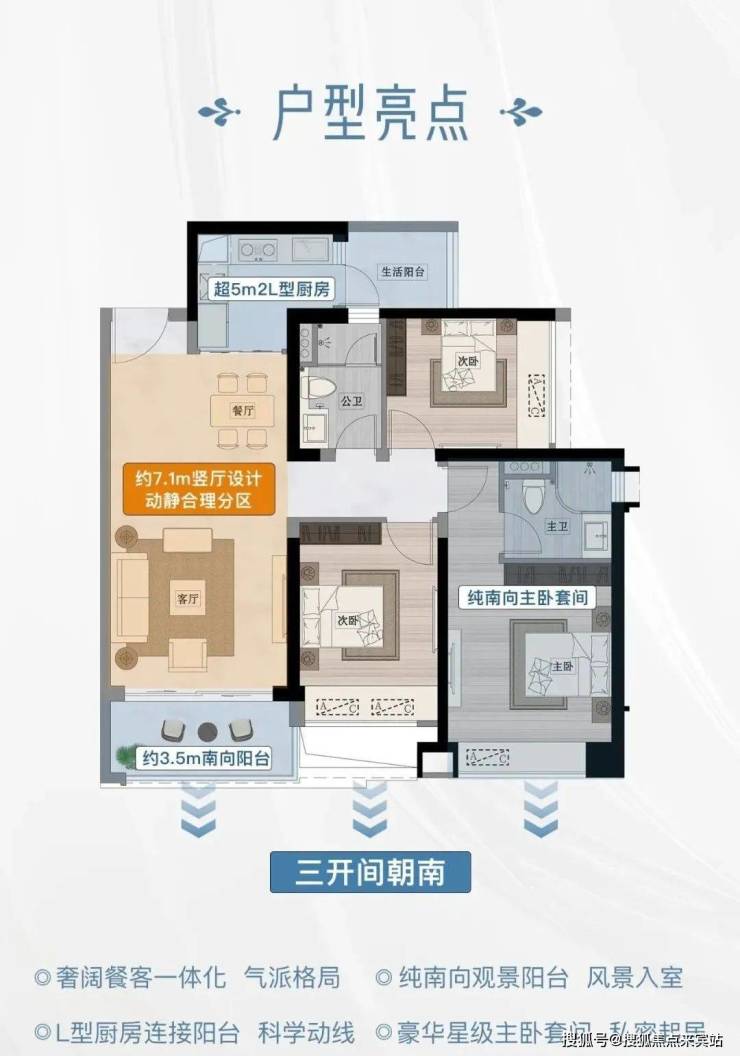 奢阔餐客双厅 · 纯南阳台 · L 型厨房 · 豪华主卧套间