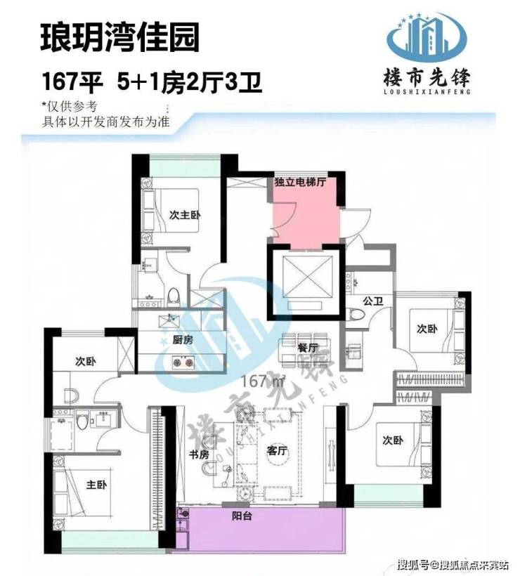 户型面积段约113-124-140-167㎡3-5房,其中124㎡的横厅和竖厅,140、167㎡全部位于高区。一梯一户且带独立电梯厅,户户带6米宽看海大阳台。
