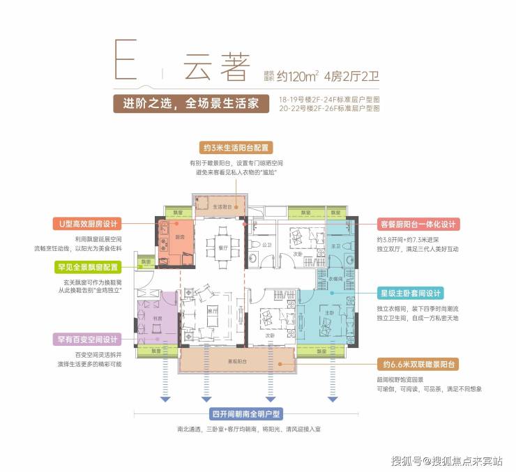 二期高层洋房:96-120㎡的 3-4 房,三面都朝南,还有 6.6 米宽的大阳台,全屋飘窗都是送的。