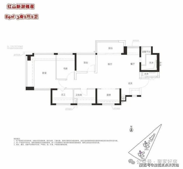 84㎡的3房2厅2卫,设计的是横厅南北通透格局,客厅3.4米开间,LDKG+X空间一体化,动静分区,主卧南北通设计,餐厅位带1个设备平台,U型厨房,卫生间干湿分离,得房率:100%(包含赠送),阳台东北朝向。